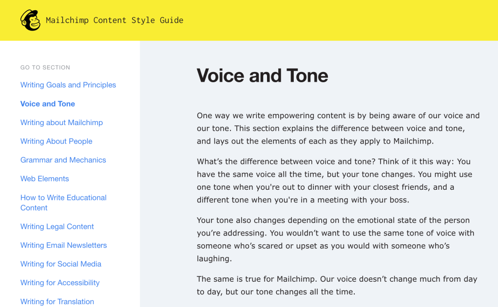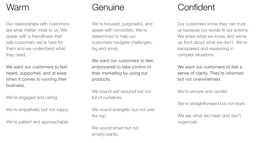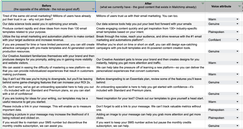 I added examples and oversaw the process, making sure that we had an even spread across the attributes, a good balance of marketing versus product messages, and equal representation of the various parts of Mailchimp’s products.